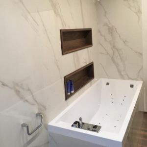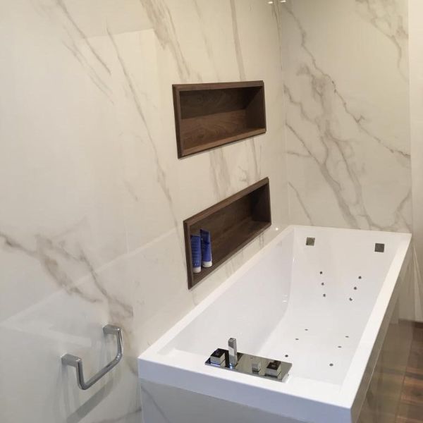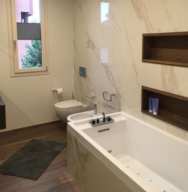 Rivestimento bagno realizzatto in lastre di kerlite marmorizzate marca Cotto d'Este dimensioni centimetri 100x300x0,55 effe